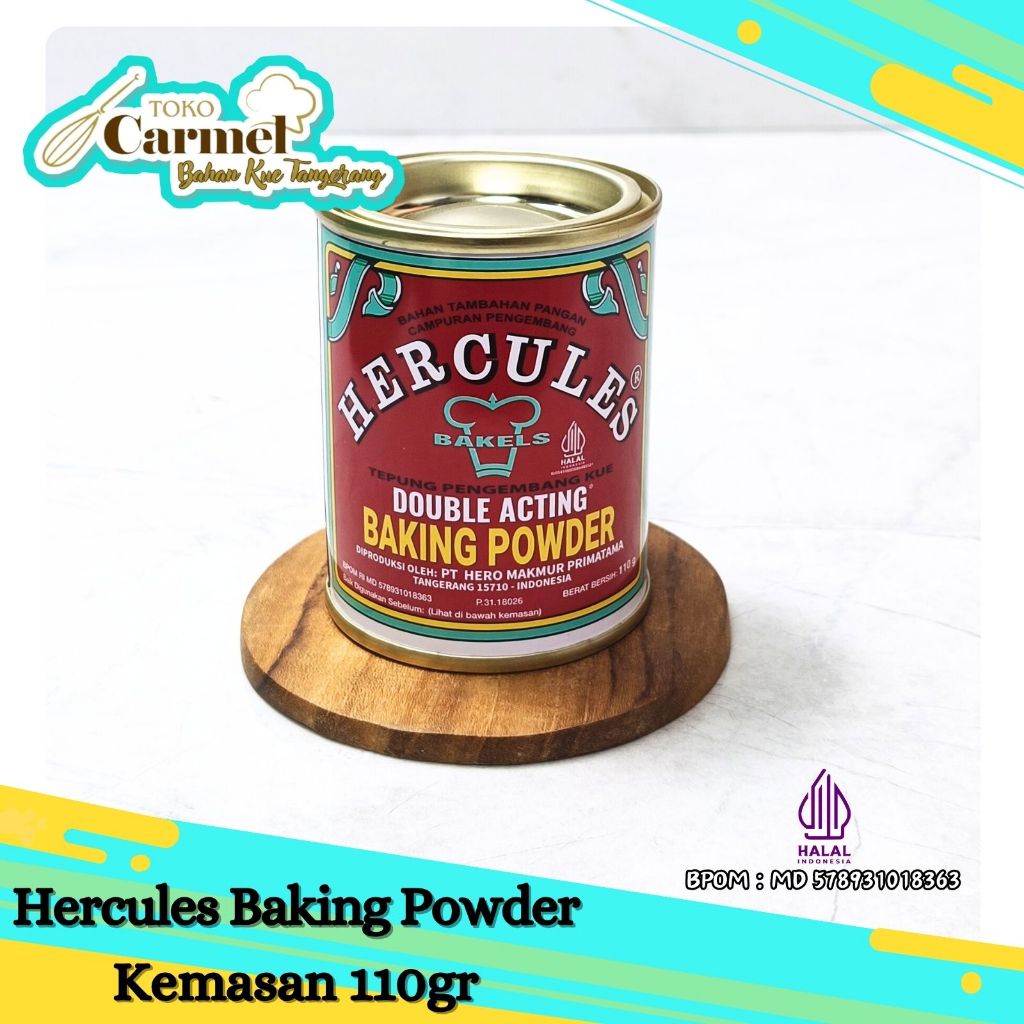 Hercules baking powder 110 Gram Double Acting / hercules baking powder double acting @110 g Hercules Baking Powder terkenal dengan pengembang kuenya yang berdaya ganda. Memiliki karakter bubble atau gelembung halus dan rapat sehingga kematangan kue merata dan tidak mudah kempis. Hercules Baking Powder pas untuk adonan kue-kue mahal yang mengutamakan penampilan. Petunjuk penggunaan: 1. Gunakan Baking Powder untuk mengembangkan makanan dengan proses pemanasan (Rebus/Goreng/Bakar/Oven) yang memerlukan tekstur gelembung udara halus. 2. Lakukan perhitungan takar dengan timbangan digital. Seyogyanya semua dalam prosentase mengacu pada berat tepung. 3. Acuan minimum pamakaian Baking powder 8 % dan max 12% dari berat TEPUNG dan disesuaikan dengan perbandingan komposisi mentega Nabati, butter, telur, madu dll.